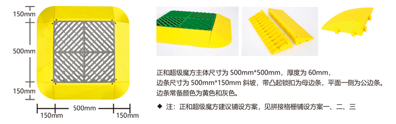 超級(jí)魔方產(chǎn)品綜合了以前產(chǎn)品的所有優(yōu)點(diǎn),包括結(jié)構(gòu)設(shè)計(jì)、防滑紋路、尺寸間距、加大鎖扣、矩陣支撐等,將產(chǎn)品厚度提升到60毫米的超高厚度,真正的實(shí)現(xiàn)了汽車店鋪的免挖溝鋪設(shè)。